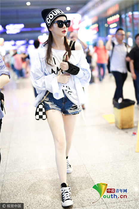 8月22日,戚薇现身上海机场,露肩装配牛仔短裤,戴毛线帽,美腿无敌,即便手绑绷带,照样比V捂脸卖萌、玩游戏。