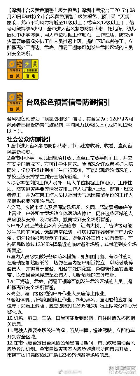 深圳新闻网讯(记者 郑创彬)深圳市气象台于2017年08月23日08时将全市台风黄色预警升级为橙色,预计受“天鸽”影响,深圳市平均风力将增至10级以上(或阵风12级以上),信号可能持续6小时,全市进入台风紧急防御状态。盐田区三防指挥部启动Ⅱ级应急响应,要求各部门各司其职,迅速行动,切实做好台风防御工作。