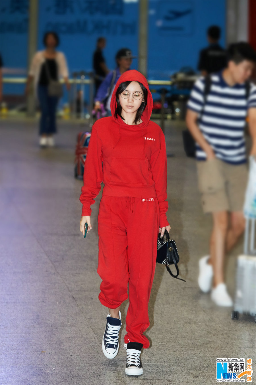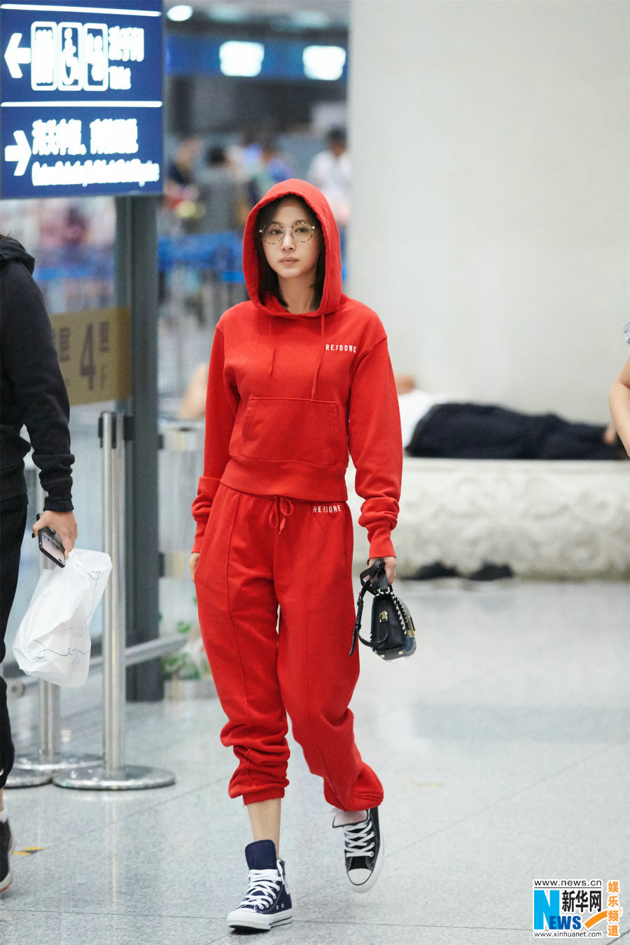 王子文机场街拍再凹运动风 红色连帽卫衣舒适又有型