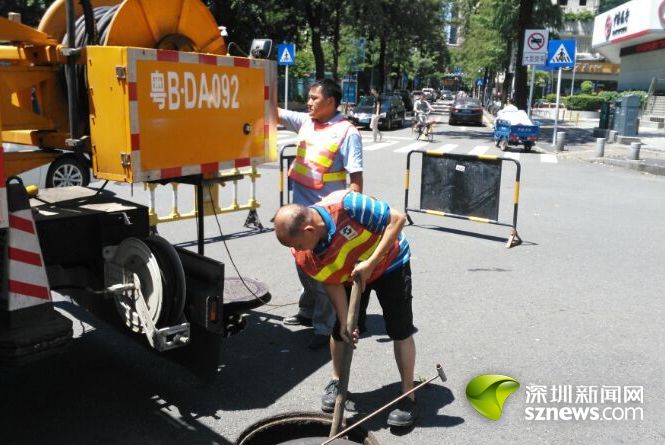 工作人员清理排水管道 通知要求,要按照《深圳市防风应急预案》、《盐田区防汛防风预案》和《深圳市台风暴雨灾害公众防御指引》要求,区住建局、经促局、教育局要迅速落实在建工地停止高空露天作业、滨海景区关停、中小学和幼儿园停课等各项工作。五、区环水局、各街道和中英街管理局、水务集团等有关单位要各司其职,做好台风带来的强降雨防御工作,加强水库防洪调度,提前做好易涝点的排涝准备工作,重点做好地下车库、老屋旧村及小区、道路积水多发地段等区域的安全隐患排除工作,提前安排应急队伍、设备和物资驻守。各单位要组织各应急队伍和专业应急力量集结待命,做好应急救援和紧急抢险准备,确保有急能应快速处理。