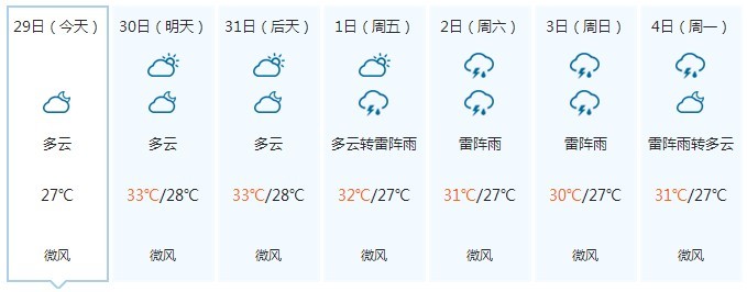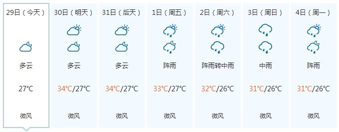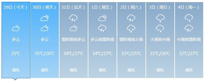 根据预报,30日,全省大部分市县晴到多云,有分散(雷)阵雨。最高温度分布:粤北、粤东和珠江三角洲市县33℃~36℃,其余市县31~33℃;31日,粤北和珠江三角洲市县多云为主,有(雷)阵雨局部大雨;其余市县多云间晴有分散(雷)阵雨。最高温度分布:粤北、粤东和珠江三角洲市县32℃~35℃,其余市县31~33℃;9月1日,南部市县多云有(雷)阵雨局部大雨;其余市县多云间晴有分散(雷)阵雨。最高温度分布:粤北、粤东和珠江三角洲市县32℃~35℃,其余市县31~33℃。