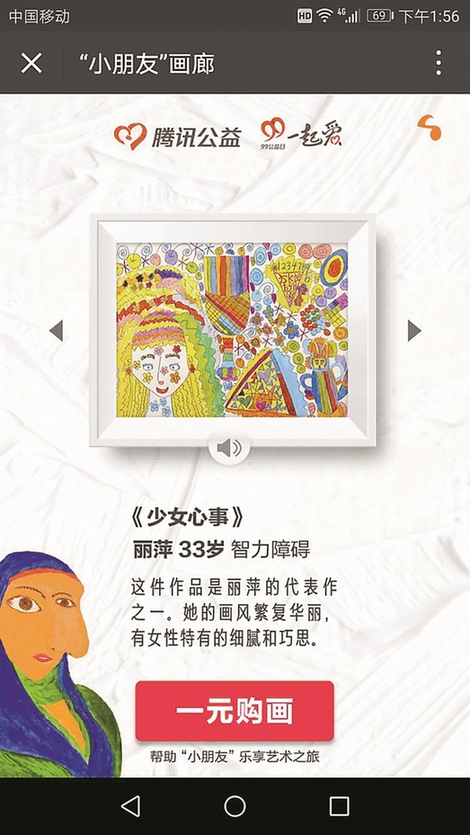 记者发现,线上画廊H5于8月28日上线,在28日晚开始迅速传播,用户可以在线上看到36幅作品,左右点击轻松切换。大部分作品都有作者亲自录制的语音,向大家说明画作的心意并表达感谢。通过H5,网友可以花一元购买电子画作,相当于给项目进行捐款,也可以给这群特殊的“小朋友”文字留言,鼓励、支持他们。有趣的是,用户“购买”后可以将电子画作保存为屏保,立即将这些充满天赋的画作用到手机上。