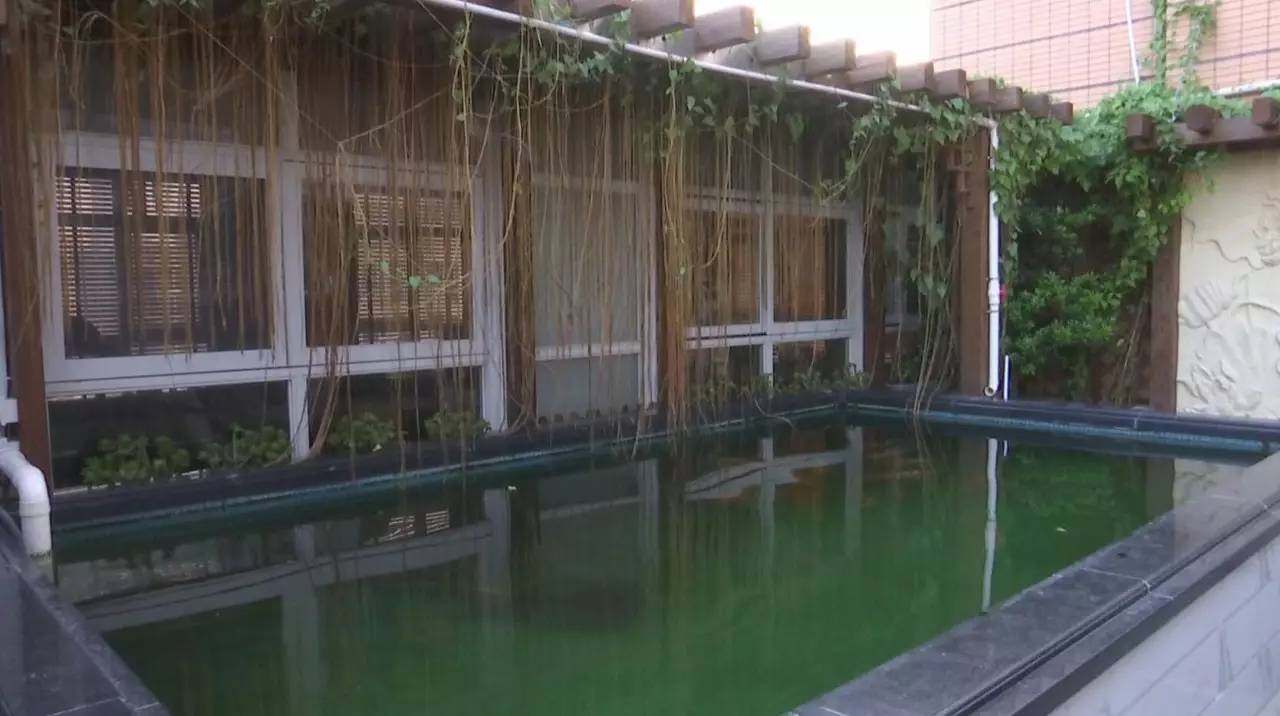 随后记者来到C1栋顶层,通过步行楼梯到天台,发现现场存留一些装修用的木板。而在通往天台处有两个安全门,推开右侧的安全门发现里面竟然还有一扇门,记者试图敲门但无人回应。记者通过左手边的门上到了天台,发现这里的景象是别有洞天,最先映入眼帘的是鱼池,而在鱼池旁边还有一个房间,在天台的空余处还摆有大棵的盆栽。