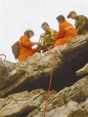 天亮之后,救援人员帮助被困人员通过悬崖。