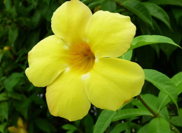 蔓性灌木,分枝柔软下垂,叶3-4枚轮生或2片对生,聚伞花序生于枝顶或叶腋,花冠黄色,漏斗状。本种花大色艳,花期长,盛花期花多而密,是美化庭园和绿地常用的木本花卉。
