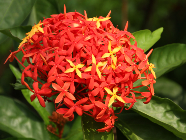 聚伞花序顶生,绣球状;花高脚蝶形,4裂;常见花色有:大红色、洋红色、黄色、粉红色、桃红色等。