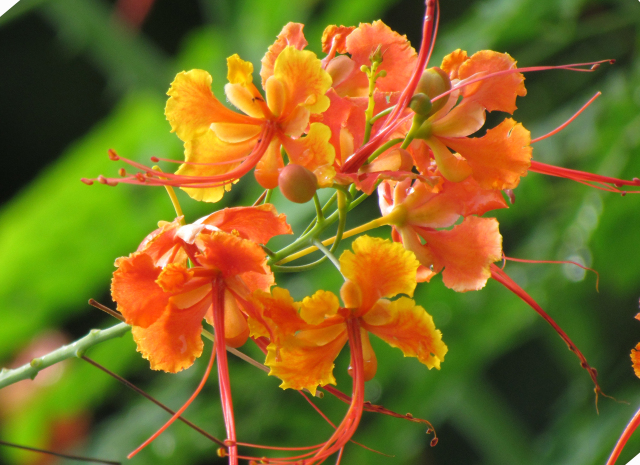 落叶灌木,伞房式总状花序顶生,花冠橙红色,边缘金色,皱波状,花丝红色,伸出花冠之外。荚果扁平。开花期间缤纷艳丽,花瓣似蝶翼,花丝似蝶须,远看宛如一群群彩蝶在绿叶中飞舞。