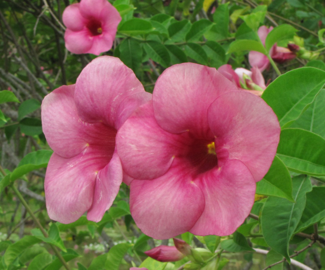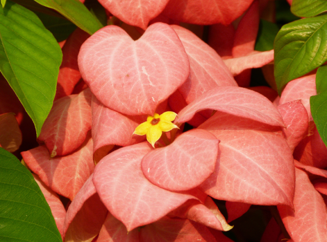 常绿灌木,伞房状聚伞花序顶生,花萼的5枚裂片均扩大呈粉红色花瓣状,花冠金黄色,檐部呈星形。