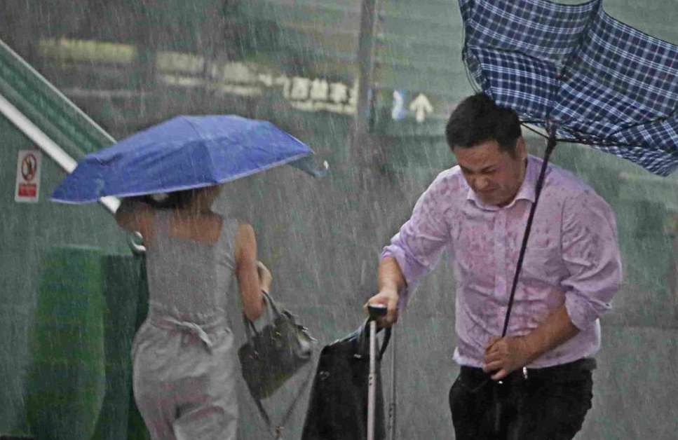 8月31日傍晚,深圳市罗湖区上空乌云密布,一场短时强降水来袭,缓解了高温闷热天气。在火车站附近,市民冒着大风大雨匆匆前行。南方日报记者朱洪波 摄影报道