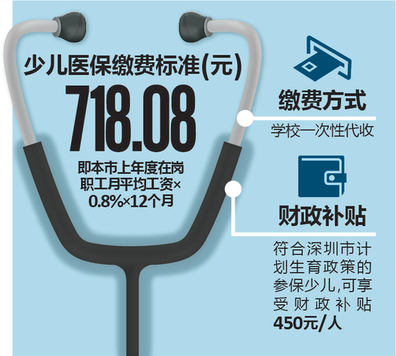 据了解,本年度深圳少儿医保缴费标准为:本市上年度在岗职工月平均工资×0.8%×12个月,即7480元×0.8%×12=718.08元。
