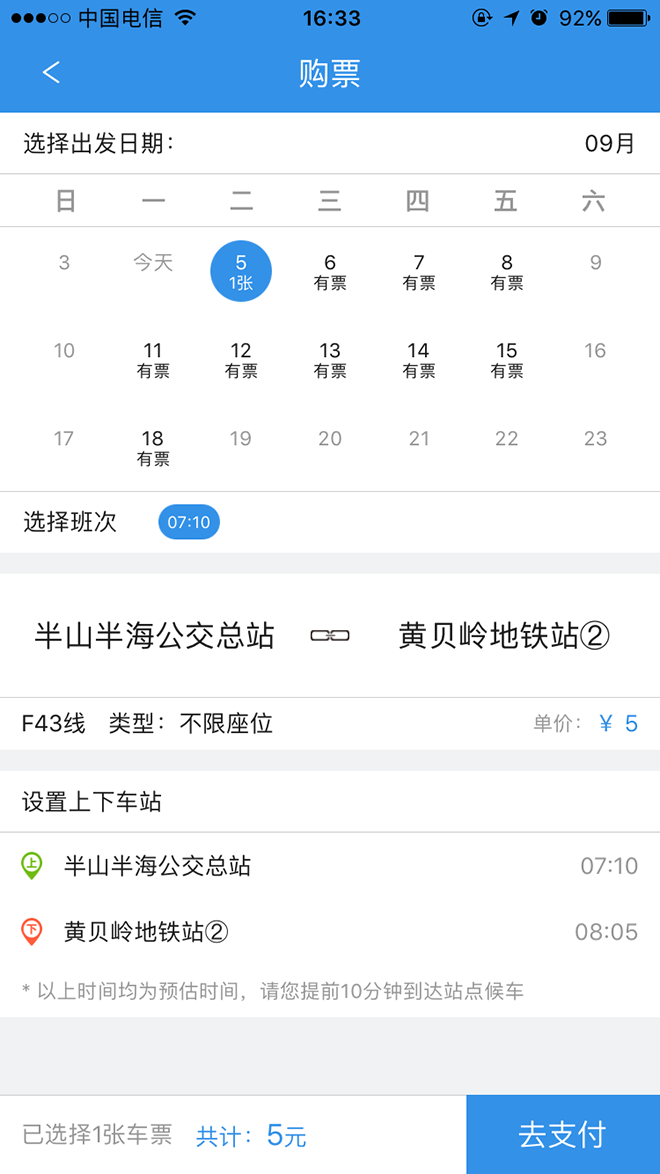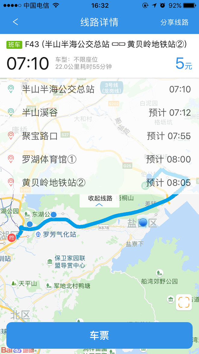 点击选择F43线 ➤ 点击页面下方“车票”➤ 选择你欲搭乘的日期➤ 点击页面下端设置你具体的上下车站点