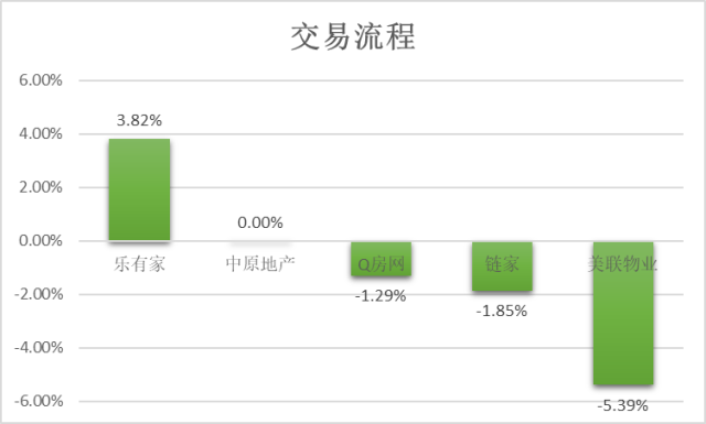 乐有家(原家家顺)在交易流程方面净推荐率最高,为3.82%;美联物业净推荐率最低,为-5.39%;其他几家品牌公司的净推荐率相差不大。