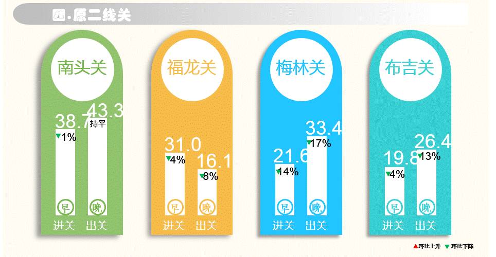 早高峰进关方向,南头关平均速度最高,为38.7km/h,环比下降1%,布吉关平均车速最低,为19.8km/h,环比下降4%;