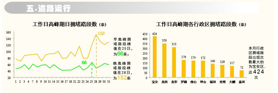 晚高峰日平均拥堵路段数量为97条,环比上升8条,其中28日拥堵道路数量最多,为152条。