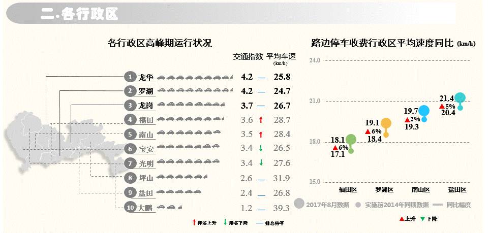 各行政区高峰期运行情况排名与上月相比稍有调整,交通指数排名前三位仍为龙华区、罗湖区、龙岗区,交通指数分别为4.2、4.2、3.7, 福田区由上月第六位上升至本月第四位,交通指数为3.6。