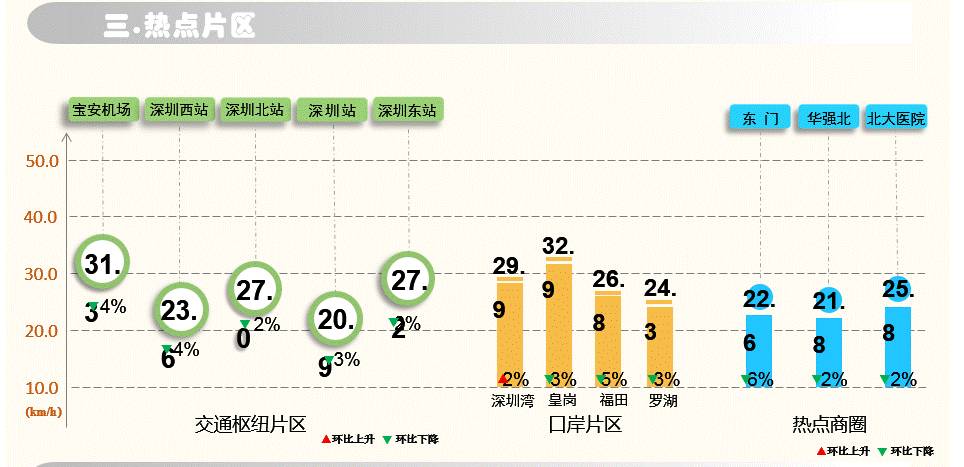 高峰时段各交通枢纽片区中,深圳站平均速度最低,为20.9km/h,环比下降3%;宝安机场平均速度最高,为31.3km/h,环比下降4%。