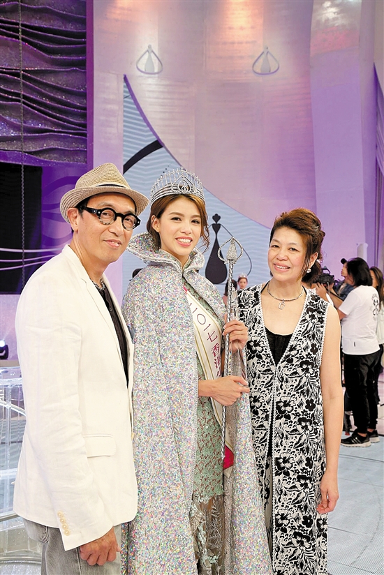 2017“香港小姐”冠军雷庄儿(中)、亚军何依婷(左)和季军黄玮琦