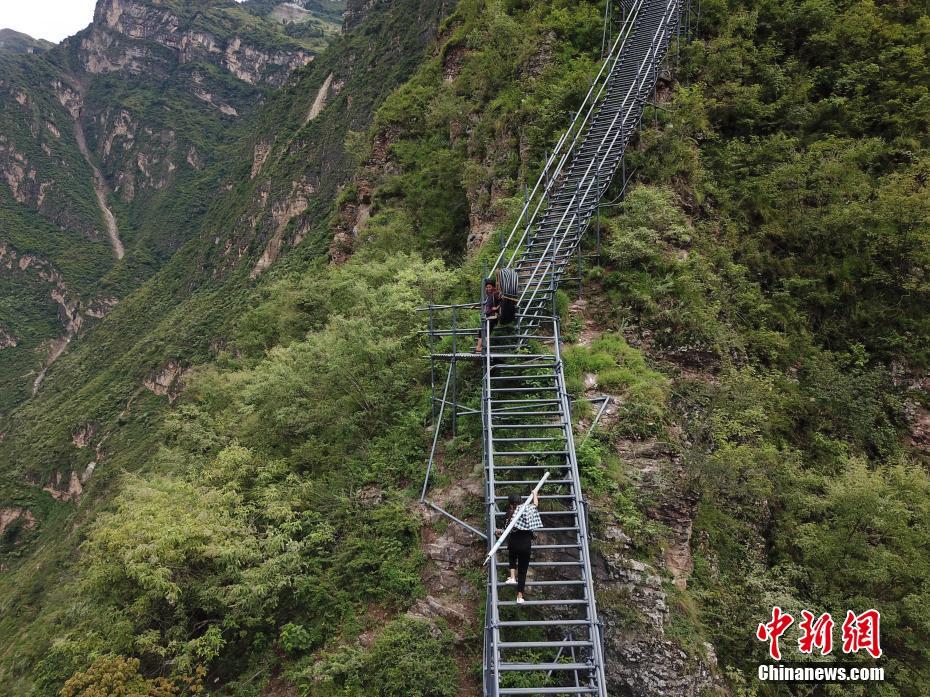 四川省凉山州昭觉县支尔莫乡阿土列尔村,坐落于海拔约1600米的山坳中,从山底到山顶村庄海拔高差近1000米,村民往返村子都需要借助悬崖峭壁间的天梯,从而被称为“悬崖村”。为缓解村民出行险的问题,当地投入120吨钢材、共6000根钢管修筑了2556级“钢管天梯”,工程于2017年6月底彻底完工,如今,“钢管天梯”已经取代了之前更危险的藤梯,成为村民通往外界唯一的道路。张浪摄