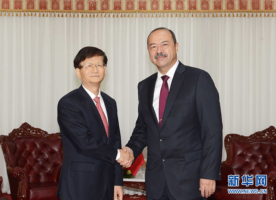 9月9日,中共中央政治局委员、中央政法委书记、中国和乌兹别克斯坦政府间合作委员会中方主席孟建柱(左)在塔什干会见乌总理、中乌政府间合作委员会乌方主席阿里波夫。新华社记者沙达提摄