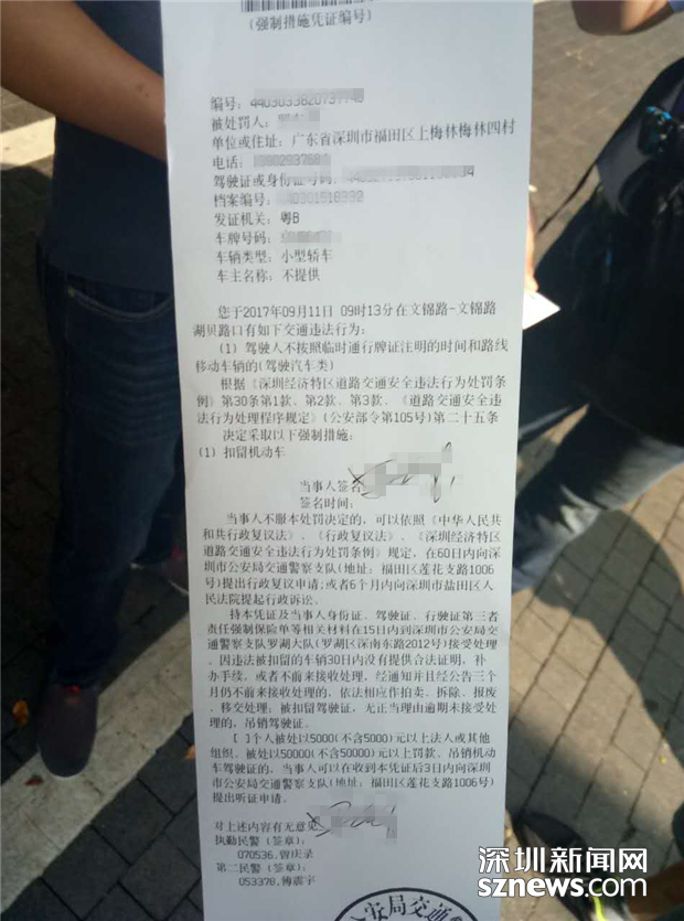 就因为临时号牌没有粘贴,大清早深圳交警就送来6000元和12分的“大惊喜”,车主文先生很难接受。“我是惠州的临时牌,有效期到10月5日,前段时间刚摇到了号,今天准备去车管所办理上牌的,结果就被交警查了。”他说。10分钟后,一辆粘贴着鄂L临时牌的小车被拦下,临时牌有效期到9月9日,已经过期,民警在对车辆检查时发现一副新铁牌就在后备箱中。