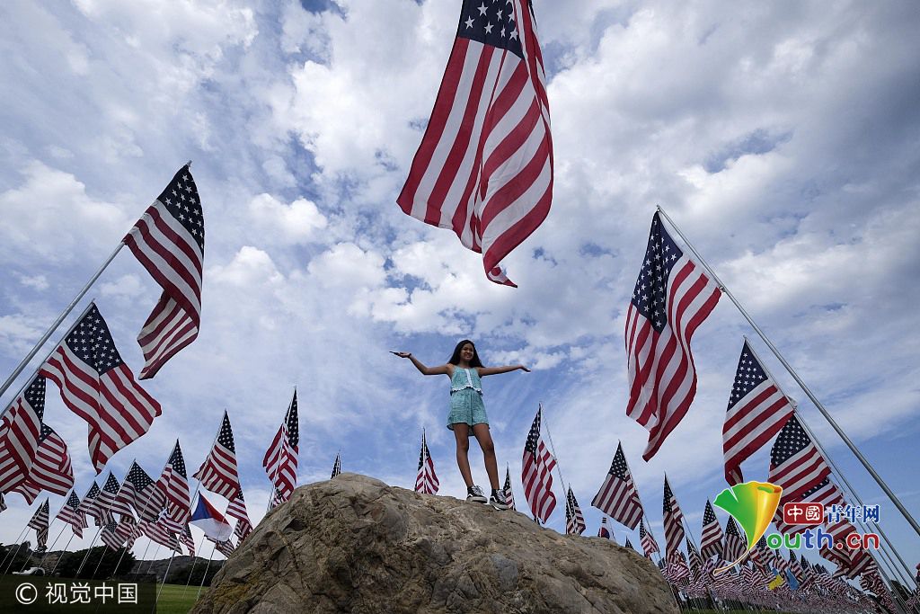 当地时间2017年9月10日,美国洛杉矶,佩珀代因大学升起3000面国旗,纪念911恐袭案16周年,悼念遇难者。