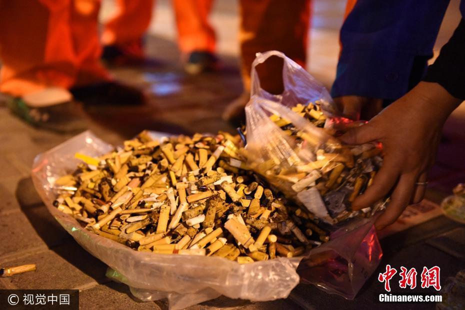 9月6日晚11点整,在西安市北门外,9个保洁员排成一排,领班的师傅简单总结了一下当日的工作,手机拍完合影作为考勤记录后,大家便结束了一天的工作。1小时前,早班的8个保洁员下班前,大家汇总在一起的烟头数量是2248个。也就是说,17名保洁员当天共捡拾烟头6348个。张晶 摄 图片来源:视觉中国