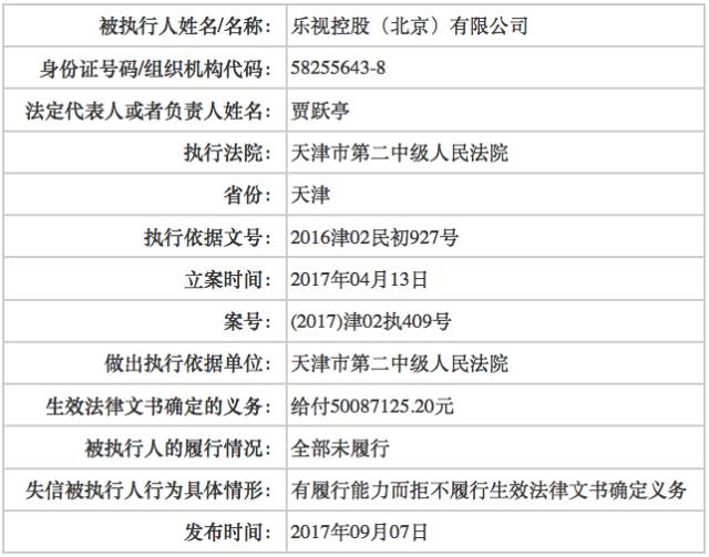 根据全国法院失信被执行人名单,乐视控股涉及的案件有两起,案号分别是(2017)津02执409号和(2017)津02执325号,执行法院均为天津市第二中级人民法院,生效法律文书确定的义务为,给付5008万元和5716万元,合计约1.07亿元。