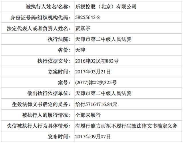 乐视移动涉及的案号为(2017)津02执325号,生效法律文书确定的义务为给付5716万元,同样,乐视移动也全部未履行,且具体情形为:有履行能力而拒不履行生效法律文书确定义务。