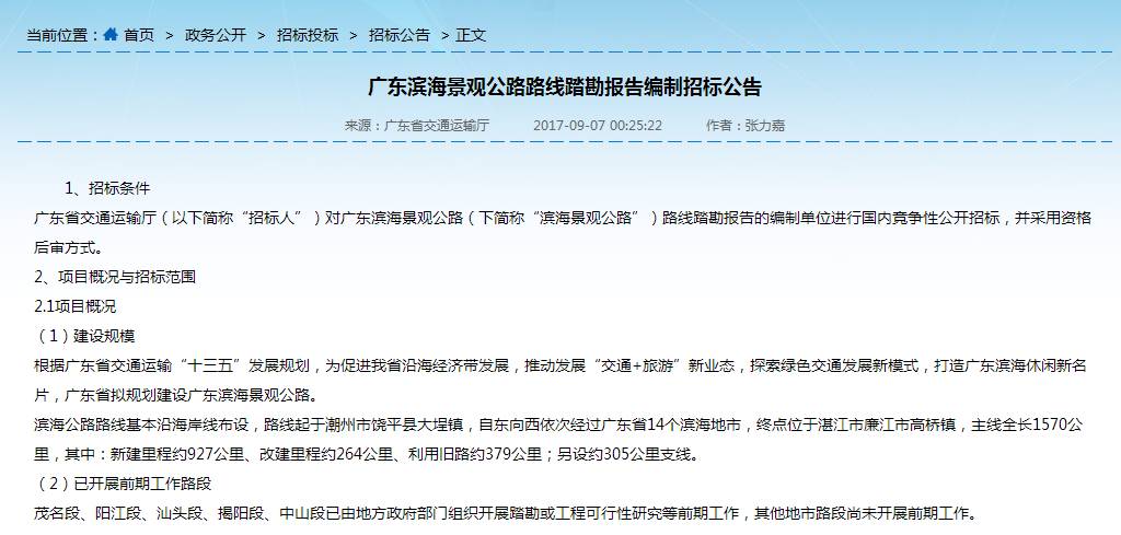 近日,省交通厅发布招标公告,对广东滨海景观公路工程的前期路线踏勘报告进行招标。招标公告显示,广东滨海景观公路将以广州为界分为两段,其中阳江段将最快于今年年底开建。
