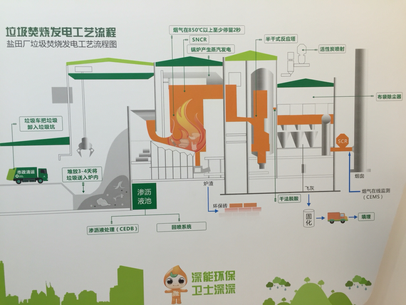 针对市民最关心的排放问题。记者从盐田厂了解到,该厂采用的是国际先进的烟气净化技术,烟气中的氮氧化物主要靠SNCR系统和SCR系统去除。烟气在焚烧炉内经SNCR脱硝去除烟气中的氮氧化物后,经余热锅炉进行热量回收后进入半干式反应塔。在半干式反应塔内,会喷射石灰浆液去除烟气中的氯化氢、二氧化硫等酸性气体。在反应塔出口,会喷射氢氧化钙干粉,进一步去除酸性气体。与此同时,喷射活性炭系统喷射出的活性炭颗粒会吸附烟气中的重金属和二噁英。