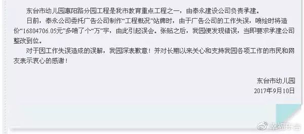 日前,泰永公司委托广告公司制作“工程概况”站牌时,由于广告公司的工作失误,喷绘时将造价“16804706.05元”多喷了个“万”字,由此引起误会。张贴之后,我园便发现错误,当即要求承建公司整改到位。