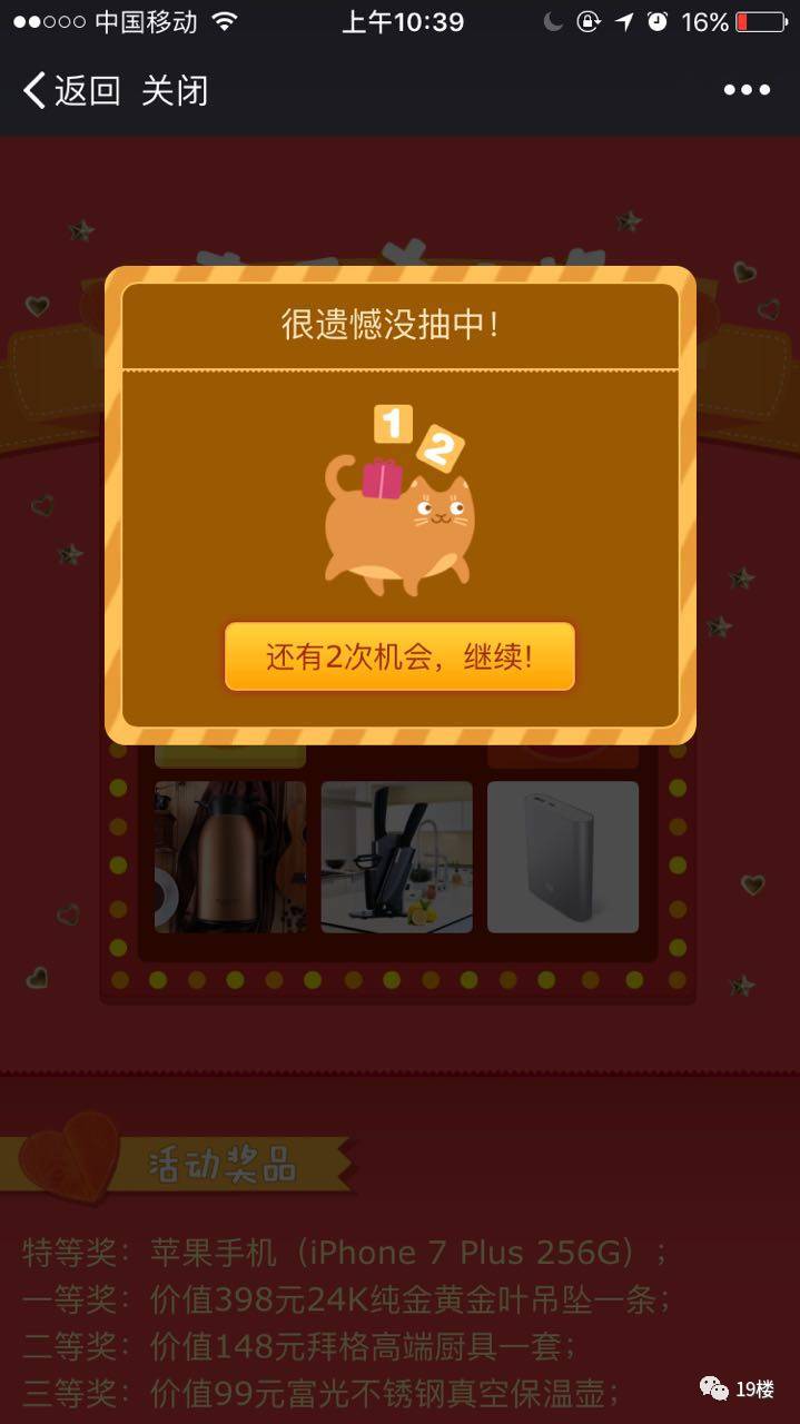 和很多诈骗手段类似,接下来的“幸运九宫格”好像满屏幕都在告诉你“二傻子,来上当啊”。好吧,姑且看看这骗子到底是如何行骗的……第一次,没抽中……