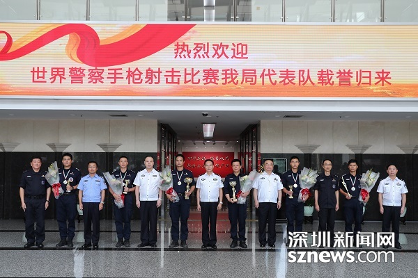 深圳新闻网讯 (记者 秦川)9月13日下午,深圳市公安局在市局指挥大楼一楼大厅举行欢迎仪式,热烈欢迎世界警察手枪射击比赛市公安局代表队载誉归来。省公安厅党委委员、副市长、市公安局长徐文海,省公安厅政治部警务训练处处长冯小钢及市公安局相关领导出席欢迎仪式,参赛代表队成员及60名民警代表参加了仪式。徐文海对代表队取得的优异成绩表示祝贺,并号召全体民警向参赛队员学习。