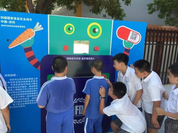 活动现场还设计了几个小游戏,吸引了很多孩子前来体验。他们排队站在游戏机器人前面,连续答对十道题之后,就有工作人员从幕后拿着礼物走出来,给孩子们惊喜。如果答错了,就会迎来一阵强风的惩罚。食安知识与游戏结合,让小朋友们印象深刻,他们纷纷表示意犹未尽,一个下午的时光过得非常有意义。