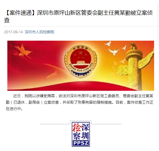 深圳原坪山新区管委会副主任涉嫌受贿被立案侦查