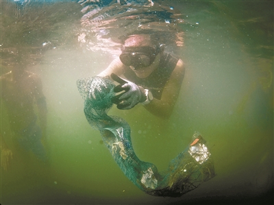 下潜到3米深的水下,在阳光的照射下,张凯仍感觉到海水是温暖的。虽然光线足够,但由于海水比较浑浊,他的能见度仅有不到一米。张凯紧紧地靠着队友向前游,很快,他们就发现了目标。“一张巨大的渔网,大概4到5米宽,像小拇指一样粗。我还看到渔网里的沙丁鱼和小螃蟹,它们都被困在里面。”张凯给队友做了一个手势,那是剪掉渔网带上岸的意思。