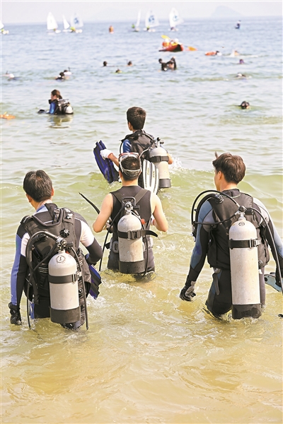 深圳新闻网讯 昨日下午2时,在盐田区大梅沙海滨公园的沙滩上,章鱼哥潜水俱乐部的教练张凯正准备着自己的气瓶、脚蹼等潜水装备。与平常不同,这一次的潜水,张凯还带上了网袋、小剪刀等用于打捞水下垃圾的工具。2004年,从第一届的深圳国际海洋清洁日公益活动开始,张凯就一直参与这项“净水”工作。