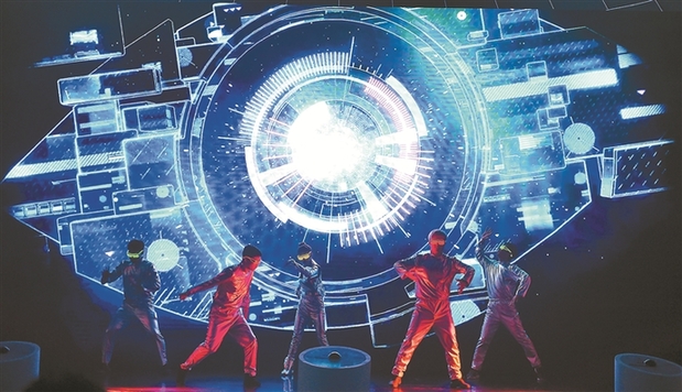 第二届深圳(国际)科技影视周昨晚开幕。图为《科技百乐门》开场秀通过全息技术,在舞台打造了全新的人息结合裸眼3D效果,佐以科技手段包装的传统歌舞演艺,将科技与生活紧密相连。深圳特区报记者 何龙 摄