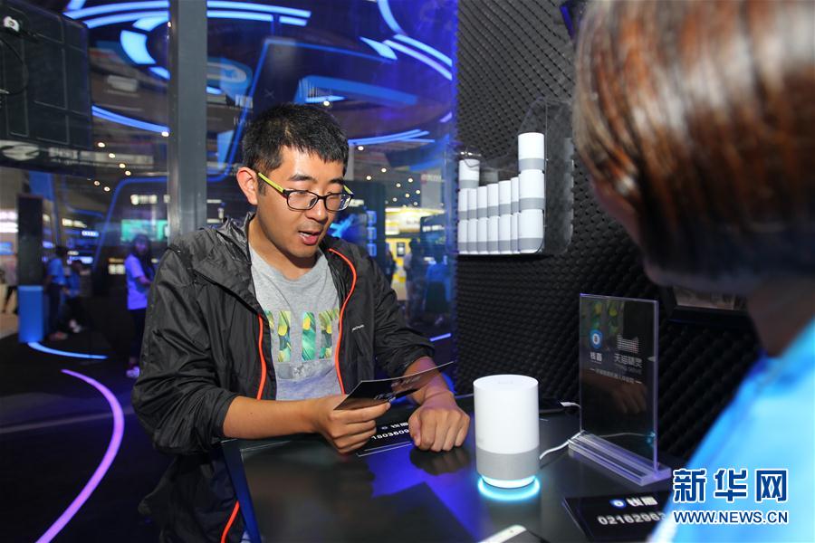 9月17日,一名观众在体验“天猫精灵”在安全防护方面的功能。新华社记者杜潇逸摄