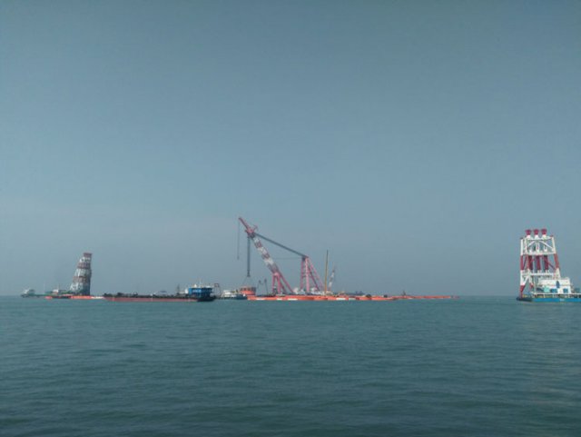 今天11点半,历时2小时,西人工岛这件由57个超大体量钢圆筒勾勒出的"海中风筝"最后一笔完美收工。