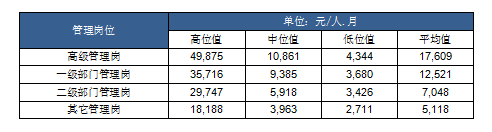 从管理岗位看,高级管理岗工资指导价位平均值最高,为17609元/月;一级部门管理岗、二级部门管理岗分别为12521元/月、7048元/月;其它管理岗最低,平均值为5118元/月,差距超过3倍。