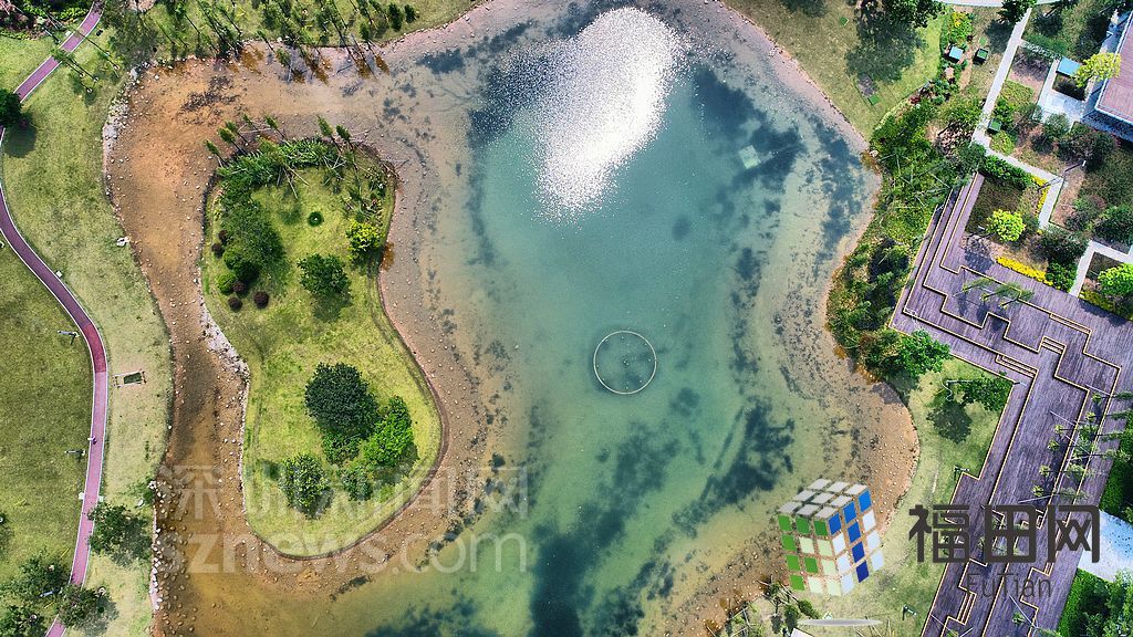 园内花蜜湖在阳光的照耀下闪耀着光泽。