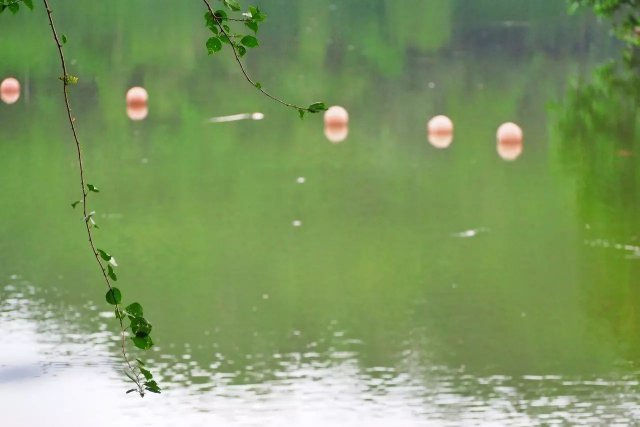 远处仙湖碧波荡漾,一株绿植蜻蜓点水,