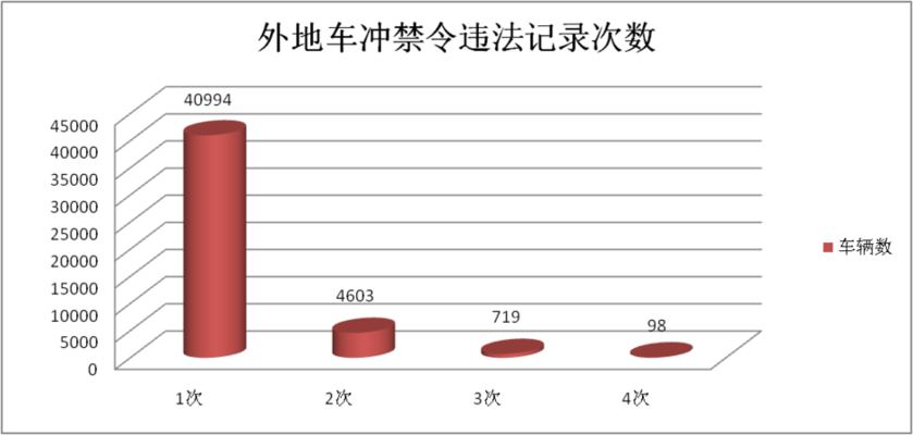 9月1日开始,在全市范围对外地车在工作日高峰期违反禁行规定的违法行为正式进行执法,截止至9月14日电子警察抓拍外地车冲禁令违法车辆95841辆,共135270宗,其中属于前两次违反禁行规定的51387宗。