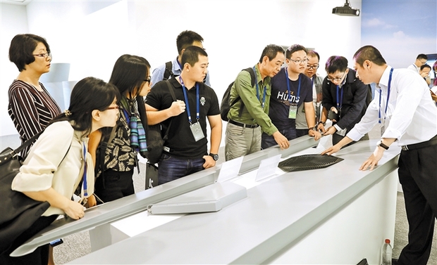 出席签约仪式的代表和嘉宾参观超材料制成的飞机翼板。 深圳商报记者 钟华登 摄