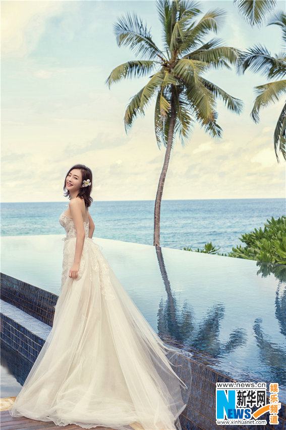 近日,秦岚为某杂志拍摄的一组唯美婚纱大片,照片中的她身穿各式纱质长裙,置身湛蓝海滩,清雅的妆容,甜美的笑容,举手投足间尽显别样魅力。