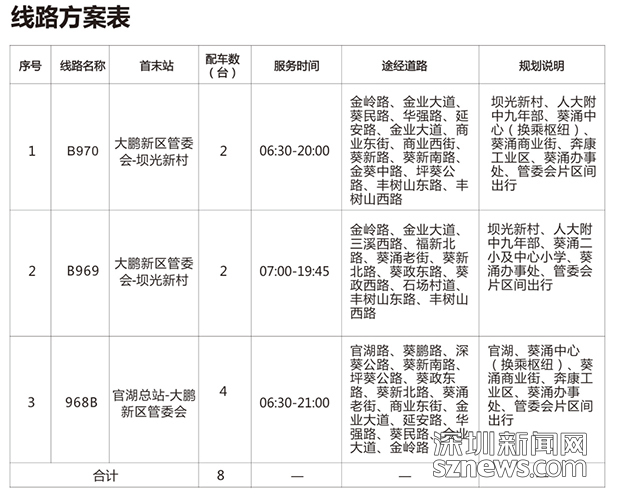 9月21日,大鹏新区9688、B969、B970等3条微巴线路开通。该三条线路采用长度为7米以下的微型纯电动公交车辆,共配车8台,有效解决了坝光新村、人大附中九年部、葵涌中心、葵涌商业街、奔康工业区、葵涌办事处、大鹏新区管委会片区等区域的公交覆盖,为市民提供了安全便捷、环保经济的短距离公交出行需求。