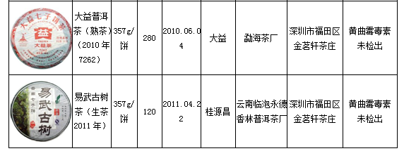深圳市消委会介绍,此次测评的十款普洱茶,有五份熟茶和五份生茶,价格从100元/饼到400元/饼不等,包含了中茶、大益、老班章、易武、八马茶叶五个品牌。检测指标和检测方法与检测机构及茶叶专家沟通讨论,确定本次检测的黄曲霉毒素包括黄曲霉毒素B1、B2、G1、G1,检测方法参照“GB 5009.22”进行。检测结果显示,十款普洱茶中均没有检出黄曲霉毒素。
