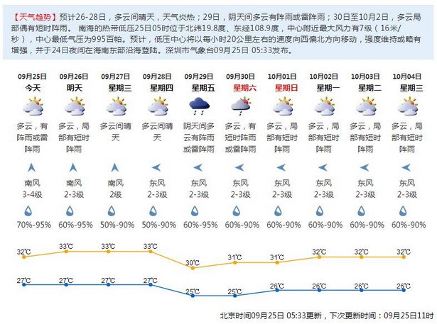预计南海中部热带低压对我市无直接风雨影响。本周深圳天气多云偶有阵雨。其中,25日多云,有短时阵雨,沿海和高地最大阵风6~7级,气温27℃~32℃;26-28日多云到晴天,天气炎热;29~30日受弱冷空气影响,云量增多,转阵雨,炎热缓解。(深圳商报记者罗洁琳)