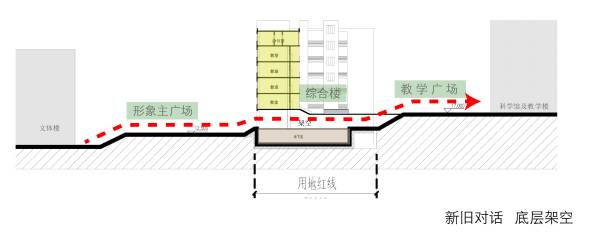 同时利用场地高差三台地,建立“两轴一心”。沿中轴线走进校园,到达教学核心区。